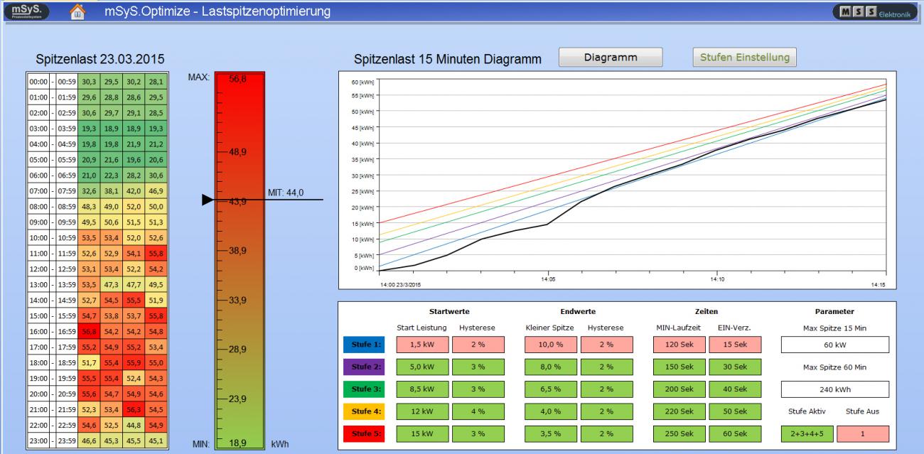 Der mSyS.Optimize Loadcontroller schaltet bis zu 16 Laststufen innerhalb der 15 Minuten Synchronimpulse des Energieversorgers.