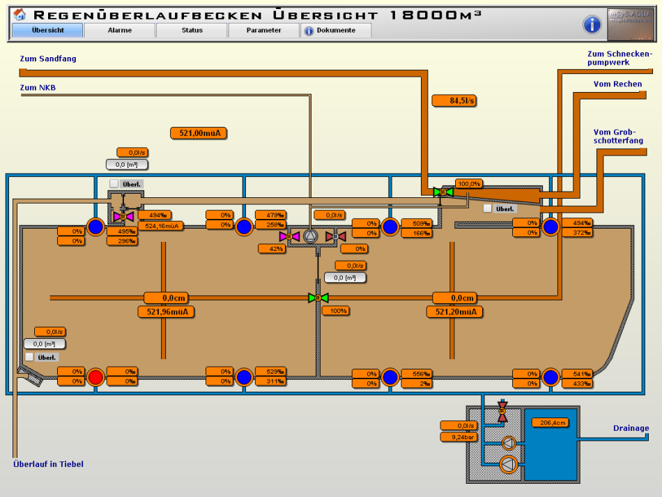 Das Konzept sieht vor, je Becken 4 stationäre Wasserwerfer zu montieren und über ein Nutzwasserpumpwerk die nötigen Wassermengen für die Reinigung zur Verfügung zu stellen.