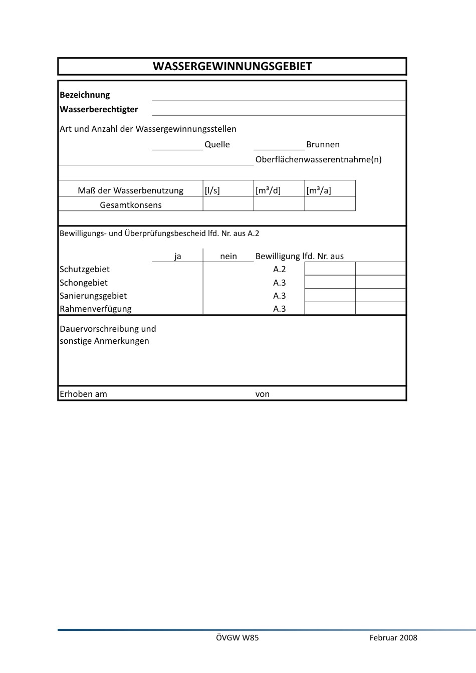 Als Formular der W85 Wassergewinnungsgebiet