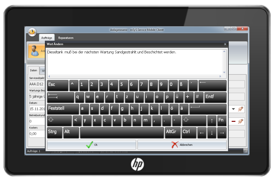 - Hinterlegen von zusätzlichen Informationen für spätere Wartungen bzw. Überprüfungen, bearbeiten der zusätzlichen Informationen